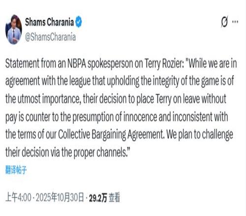 球员工会的一位发言人表示:“尽管我们与联盟一致认为维护比赛公正性至关重要,但他们让特里停薪的决定,既违背了无罪推定原则,也与劳资协议的条款不符。我们计划通过正当渠道对这一决定提出异议。”