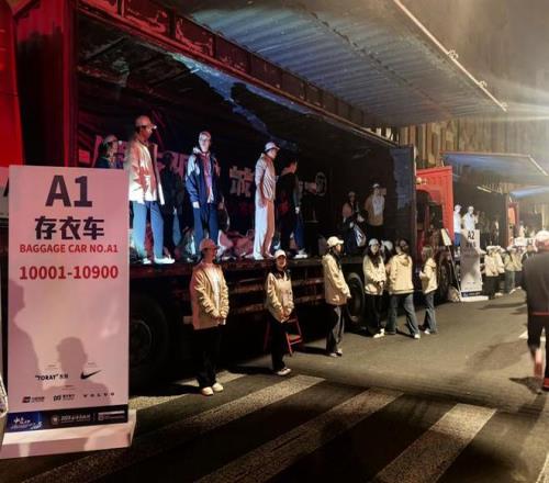 23辆存衣车按区域编号,发枪之后,赛道上跑者不遗余力地向前,赛道外数万件衣物则在“小马达”的护送下开启它们的“赛道之旅”。